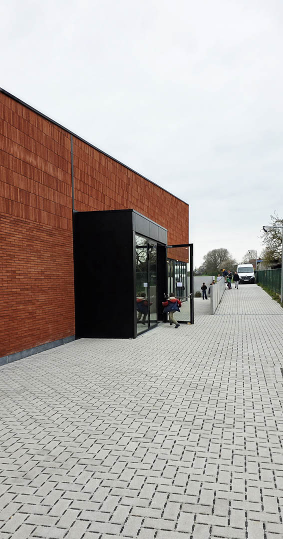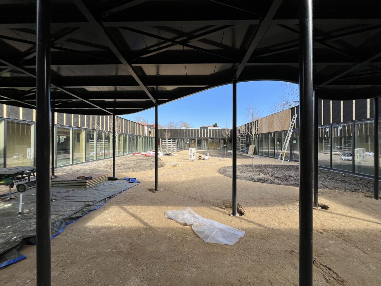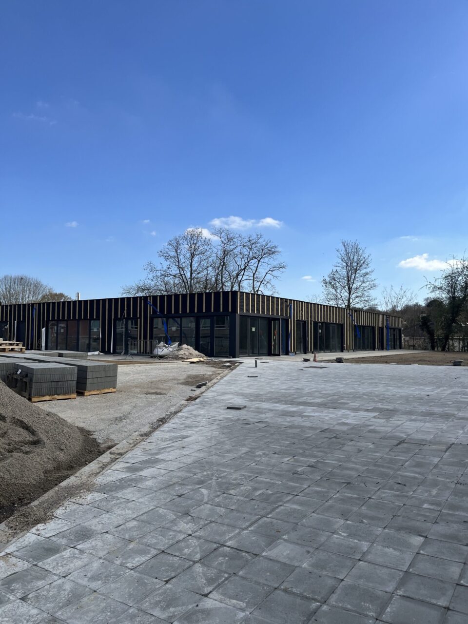 Parallèlement, le chantier se poursuit avec les finitions intérieures (peinture des murs et des menuiseries, pose du linoléum dans les classes et les couloirs, installation d’un faux plafond métallique dans le couloir) ainsi qu’avec les travaux d’aménagement des abords : cour de récréation, cheminements pavés et structuration des principales zones végétalisées.