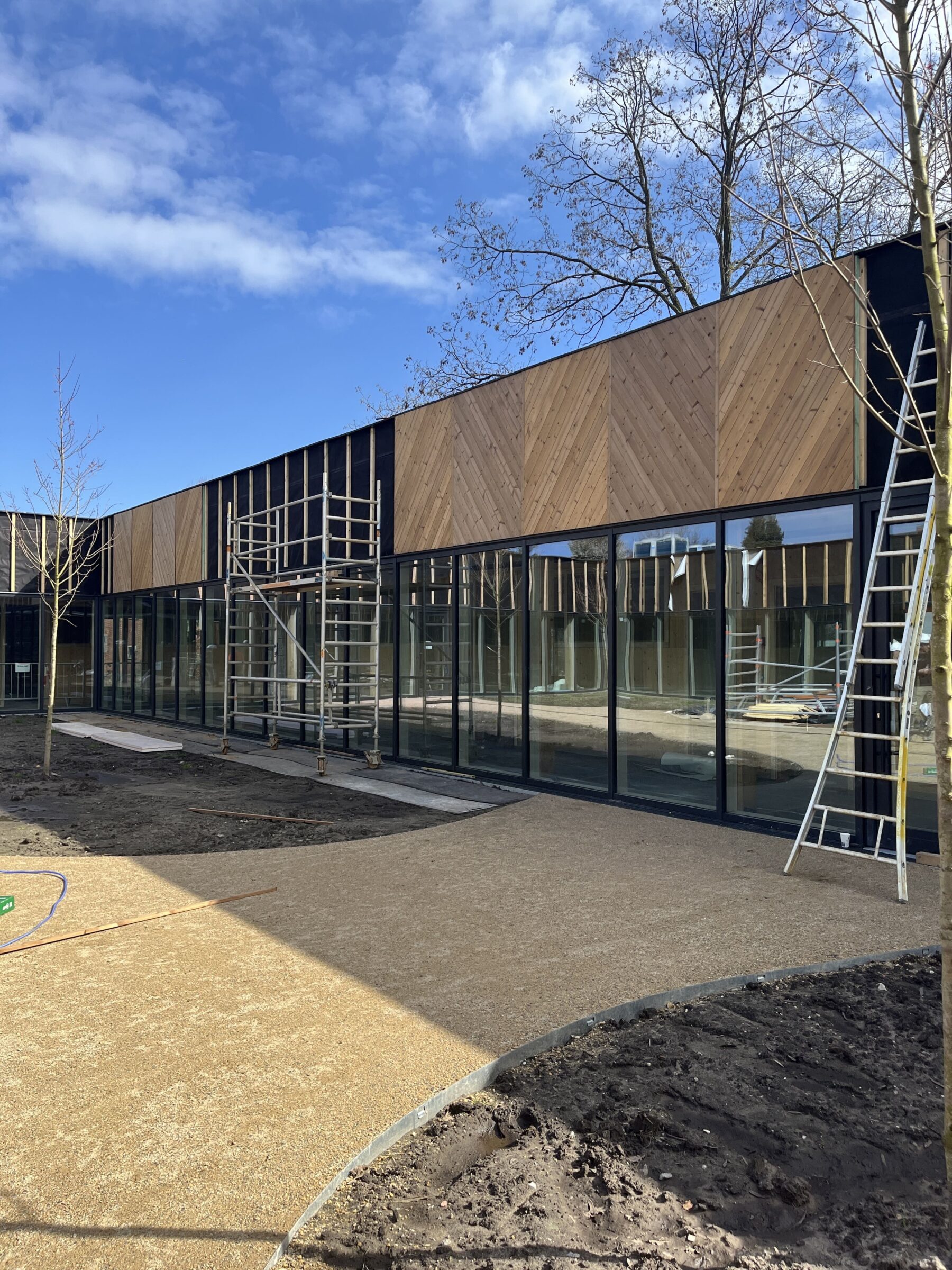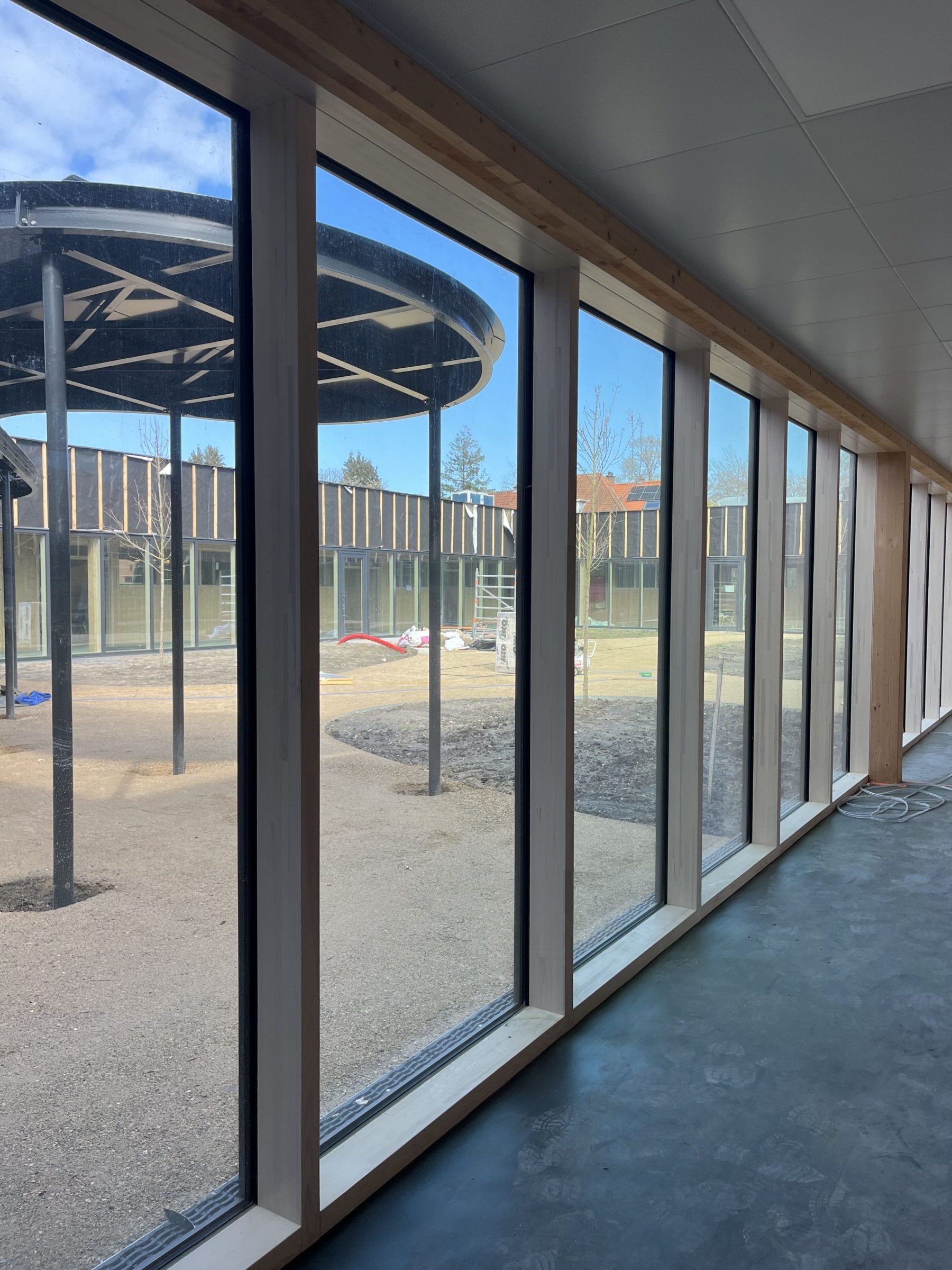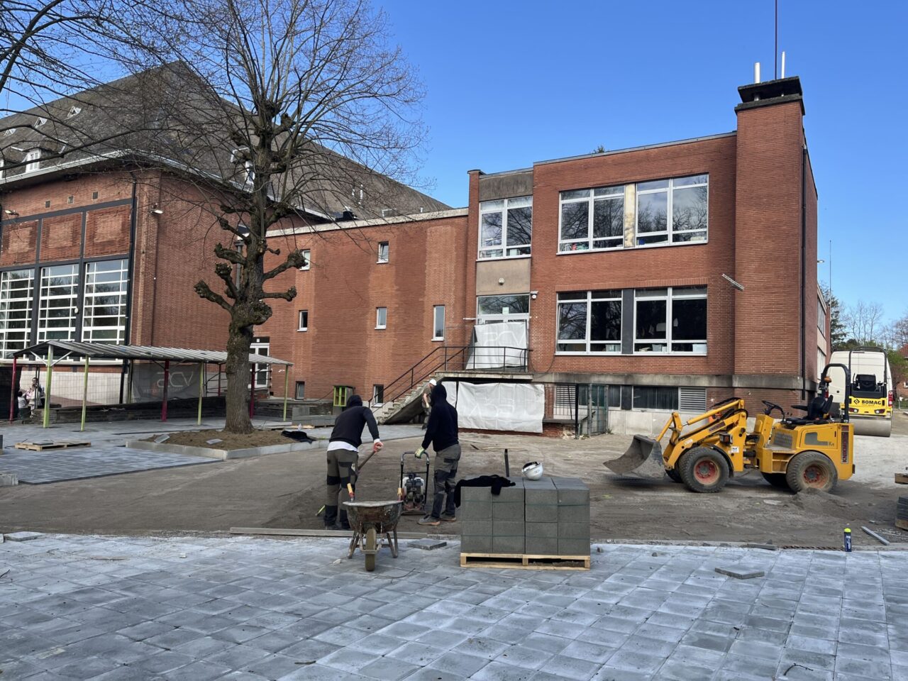 Parallèlement, le chantier se poursuit avec les finitions intérieures (peinture des murs et des menuiseries, pose du linoléum dans les classes et les couloirs, installation d’un faux plafond métallique dans le couloir) ainsi qu’avec les travaux d’aménagement des abords : cour de récréation, cheminements pavés et structuration des principales zones végétalisées.