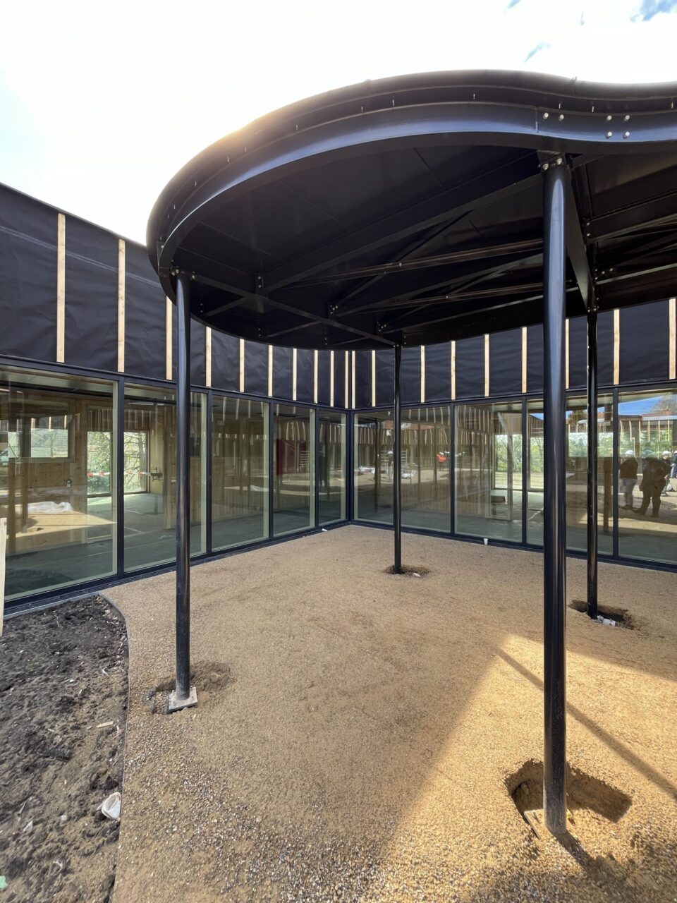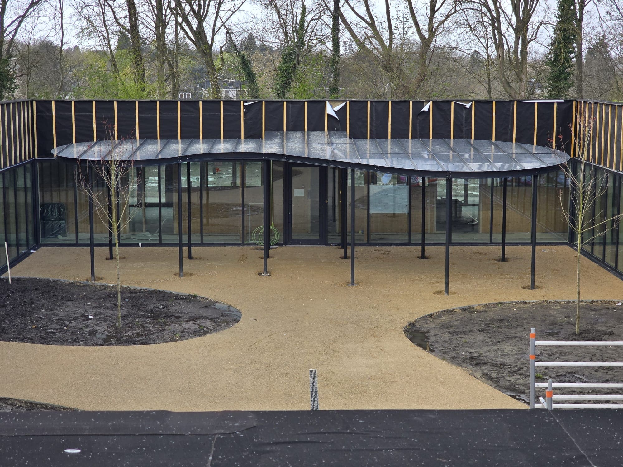 Le préau (surnommé « blob ») vient compléter l’aménagement de la cour intérieure en prolongeant son dessin organique, associant zones en revêtement semi-dur et espaces engazonnés.